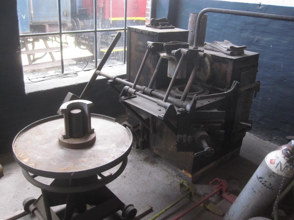 Daneben haben die Aktiven einen Gießofen aufgestellt. Dieser ursprünglich aus Salzwedel stammende Ofen diente dazu, Weißmetall zu verflüssigen, das dann zu Lagerschalen für die Achsen und Antriebsstangen von Lokomotiven gegossen wurde. Der Ofen wurde mit Heizöl befeuert. Die Bilder zeigen einerseits Lagermetall in Barrenform, andererseits den Gießofen.