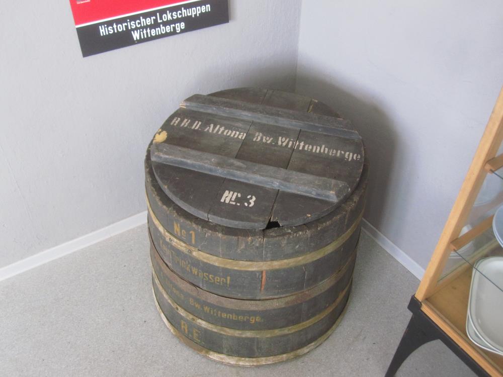 In einer Ecke des Ausstellungsraums ist eine alte Regentonne ausgestellt, die aus einem halben Fass hergestellt wurde. Eigentlich nichts Besonderes. Interessant ist das Exponat wegen seiner Aufschrift „Bw Wittenberge, RBD Altona“. Sie ist Zeugnis einer Epoche bis zum Kriegsende, in dem das Bahnbetriebswerk verwaltungsmäßig zur Reichsbahndirektion (Hamburg-)Altona gehörte.