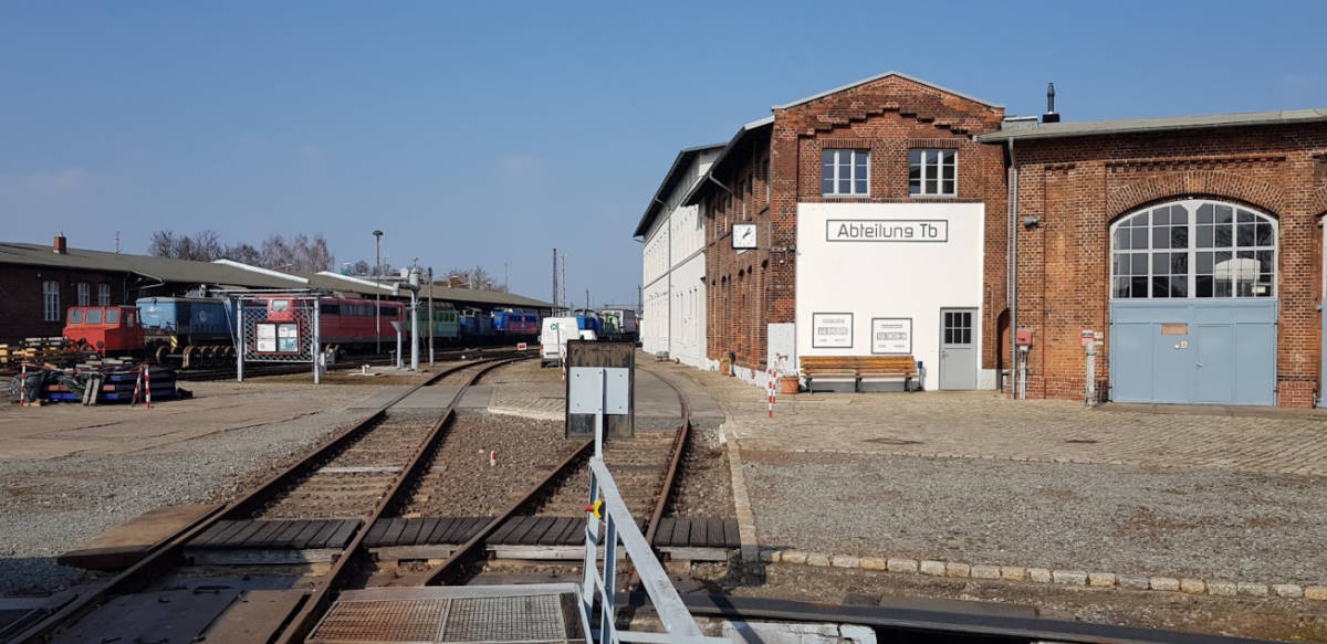 Blick auf die ehemalige Magdeburger Bahnhofsseite. Hier fuhren bis 1999 die Züge in und aus Richtung Süden. Heute finden hier unsere Führerstandsmitfahrten statt. Außerdem ist ein Gleisbaumaschine ausgestellt. Die Brachfläche daneben wird seit kurzem durch eine Straße und ein kleines Einkaufszentrum belebt.