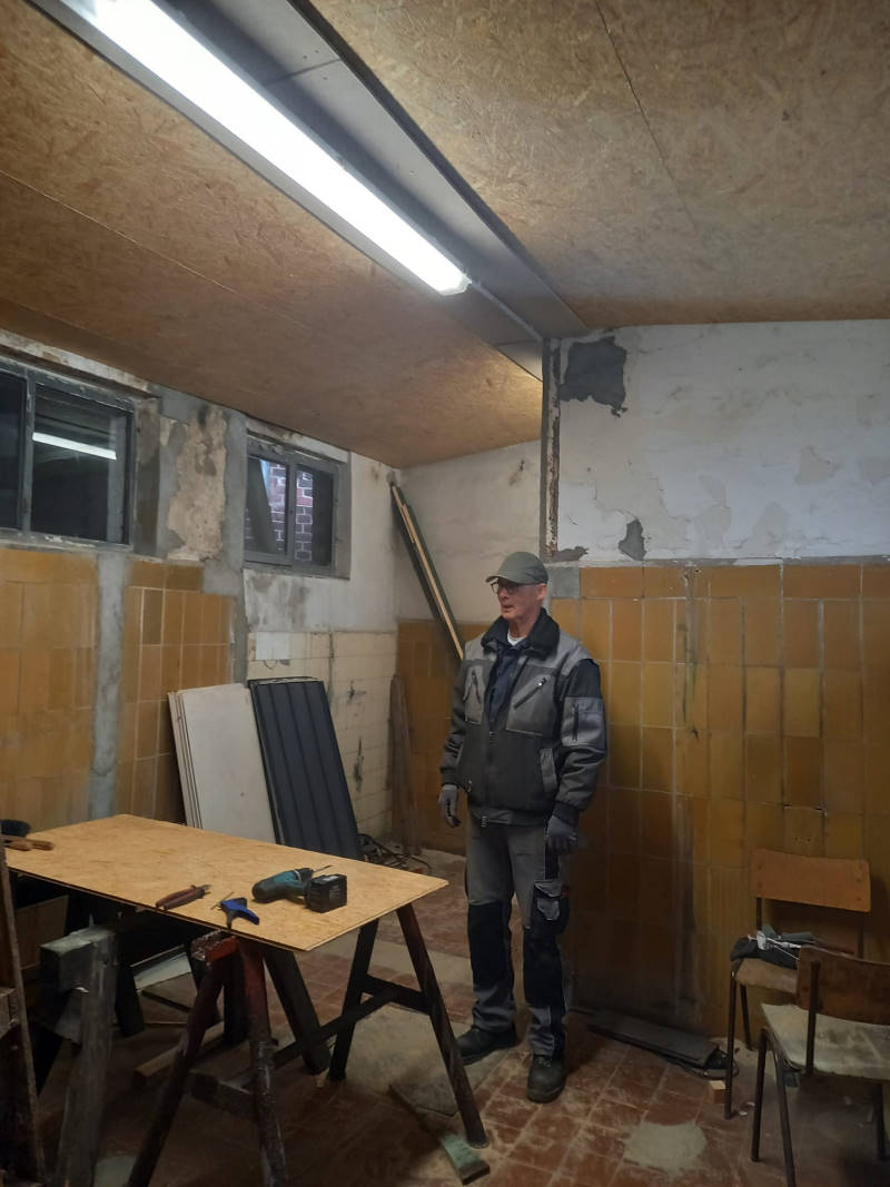Fortschritte macht auch der Raum, der zukünftig unser Kleinteilelager beherbergen soll. Hier wurde die Decke verkleidet und elektrische Beleuchtung installiert.