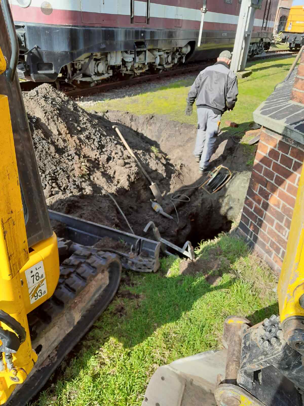 Beim Befüllen des Wasserturms nach der Winterpause stellten wir fest, dass irgendwo außerhalb des Turms Wasser versickerte. Wie sich herausstellte, war eine Transportleitung zum ehemaligen Kohlenlagerplatz undicht geworden und das Wasser versickerte dort im Gelände. Nun musste der Absperrschieber für diese Leitung gefunden und geschlossen werden. Zum Glück fand er sich nahe des Wasserturms.