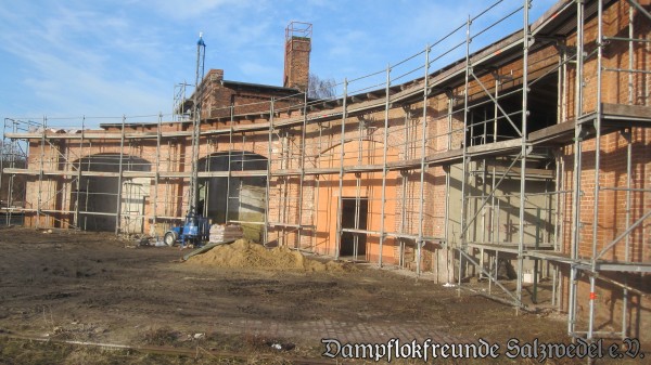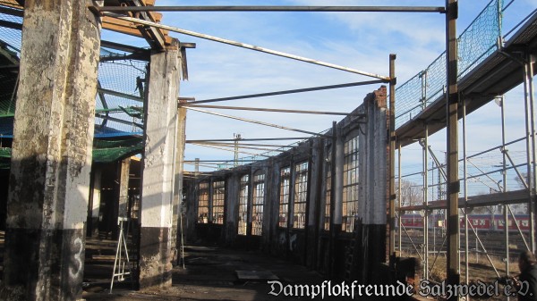 Witterungsbedingt mussten die Bauarbeiten am und im Bw Wittenberge von Anfang Januar bis Mitte Februar ruhen. Eis und Schnee machten insbesondere weitere Dacharbeiten unmöglich. Inzwischen sind die Handwerker aber wieder aktiv und so sind seit einer Woche wieder Fortschritte zu erkennen: