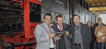 Ein besonderer Moment: Minister Vogelsänger, Dirk Endisch und Bürgermeister Dr. Hermann (v. l.) mit dem neuen Heimatschild für die einstmals in Wittenberge "stationierte" Dampflok. |