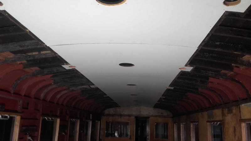 Erwähnenswert ist sonst noch, dass die Aufarbeitung unseres Triebwagen-Beiwagens 197 805 erkennbare Fortschritte macht. Nachdem die Fenster neu eingesetzt wurden, kann nun die neue Innenverkleidung angepasst und eingebaut werden. Hier zwei Bilder vom Baufortschritt: