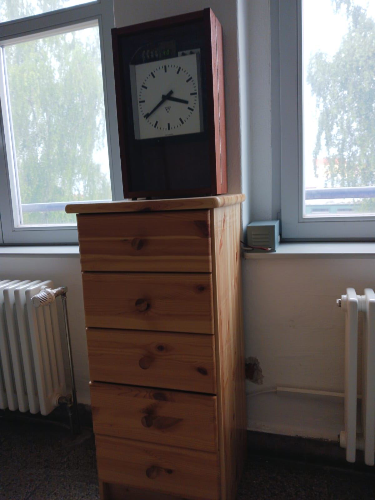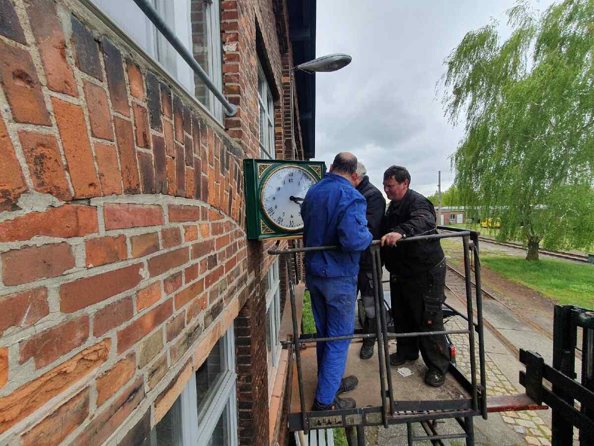 Nebenbei haben wir noch eine historische Uhr am Lokschuppen installiert und sie mit einer Mutteruhr verbunden, damit sie auch richtige Uhrzeit anzeigt.