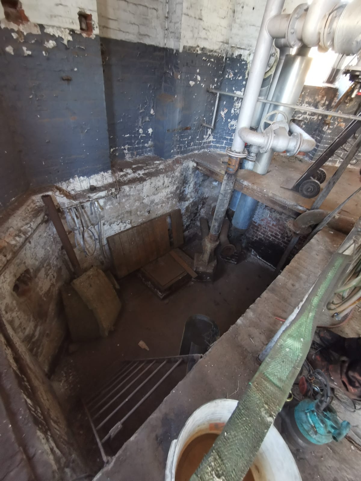 Wir erkennen einen rund vier Meter tiefen Schacht, der eine Grundfläche von vier mal vier Metern hat. Wir haben eine neue Treppe erstellt, die Saugleitung aus dem Brunnenschacht wiederhergestellt und eine elektrische Pumpe eingebaut.